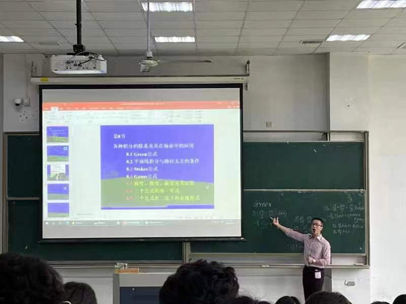 江教授以精心设计的教学流程、落落大方的教态、活跃的课堂气氛,呈献了三节精彩的课程。本次课程在已学习与证明多元函数微积分Green公式、Stokes公式、Gauss公式的基础上,深入阐述三大公式与梯度、散度、旋度之间的内在联系,使学生真正弄懂三度运算的正确含义;继续拓展三大公式的统一形式,透过现象看本质、从微观细节提升到宏观大局;最终在梯度、散度、旋度的表现形式下,再次更新阐述Green公式、Stokes公式、Gauss公式的另类表达。