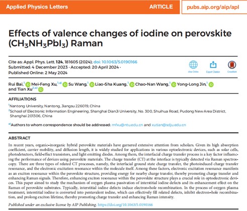 近日,看球直播下载 许美凤博士与上海电机看球直播下载 许田教授合作,在以钙钛矿为基底的拉曼增强方面取得新进展。相关研究成果以《Effects of valence changes of iodine on perovskite (CH3NH3PbI3) Raman(碘的价变化对钙钛矿(CH3NH3PbI3)拉曼的影响)》为题,南通大学为第一单位,许美凤博士为共同第一作者兼共同通讯作者、许田教授为共同通讯作者发表在自然指数期刊《Applied Physics Letters》(《应用物理快报》)上。