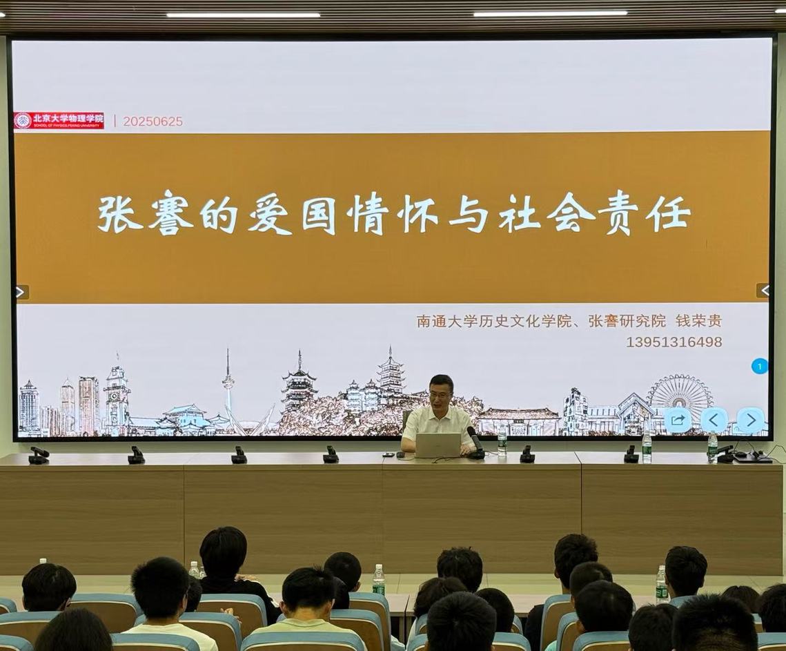 6月25日,39号楼A112教室座无虚席,南通大学历史文化看球直播下载 、张謇研究院院长钱荣贵教授应邀来院作题为“张謇的爱国情怀与社会责任”主题讲座。北京大学物理专业学生与看球直播下载-看球直播app 的学子们齐聚一堂,怀着对先贤的崇敬之情,聆听张謇精神解读。院长仲崇贵、副院长傅怀梁以及师生代表参会。