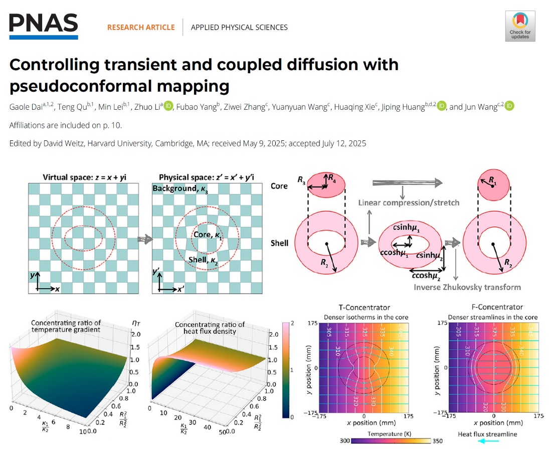 近日,看球直播下载 戴高乐博士与和合作者在扩散调控与扩散超材料设计方面取得新进展,相关研究成果以“Controlling transient and coupled diffusion with pseudoconformal mapping(通过赝共形映射控制瞬态和耦合扩散)”为题发表于《美国国家科看球直播下载 院刊》(Proceedings of the National Academy of Sciences of the United States of America,简称为PNAS),南通大学为第一署名单位。戴高乐博士、复旦大学黄吉平教授和上海第二工业大学王骏副教授为共同通讯作者。戴高乐博士、复旦大学本科生屈腾、复旦大学博士研究生雷敏为共同第一作者。