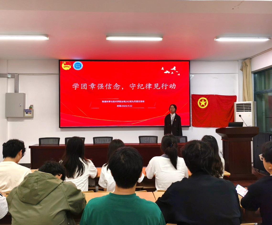 本次活动在全体团员的庄严宣誓中推向高潮。全体团员重温入团誓词,铿锵有力的誓言回荡,彰显物科团员青年坚守初心、严守纪律的坚定决心。今年正值纪念中国人民抗日战争暨世界反法西斯战争胜利80周年,支部成员共同回顾了九三阅兵时的震撼场景,学习了团中央“弘扬伟大抗战精神,做光荣自豪中国人”的思政大课,团员们深受触动,纷纷表示将以此次活动为契机,继续传承红色基因、严守纪律规矩,以过硬本领在强国建设、民族复兴的征程中挺膺担当。