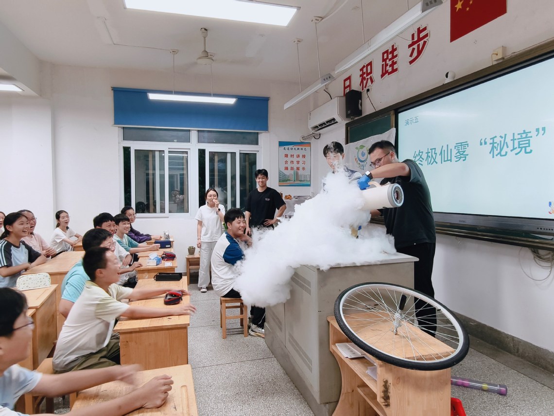 活动现场,志愿者们精心准备了五个精彩纷呈的实验项目,将抽象的物理原理转化为直观可感的奇妙现象:“乒乓球大炮”实验:利用压缩空气瞬间释放产生的强大推力,将乒乓球高速“发射”,生动展示了气压差的威力;楞次定律小球实验:通过磁铁在铜管中缓慢下落的现象,形象诠释了电磁感应中的“阻碍变化”原理;“不倒的车轮”实验:志愿者手持铜管作为转轴,高高举起一个高速旋转的自行车轮——当车轮转动时,整个系统展现出惊人的方向稳定性,即使倾斜或晃动,车轮仍“倔强”地保持旋转轴方向不变,生动诠释了角动量守恒定律在空间中的表现;“辉光球”实验:当同学们伸手轻触辉光球表面,绚丽的电弧随之汇聚于指尖,高压电场的奥秘在光影中跃然眼前;干冰升华实验:干冰遇水迅速升华,腾起缭绕“仙气”,不仅带来视觉震撼,更引导学生理解物质状态变化的本质。每一个实验都伴随着同学们的惊叹与欢笑,志愿者们不仅耐心讲解实验步骤,更注重引导学生思考“为什么”和“怎么样”,在动手实践中培养科学思维与探究精神。
