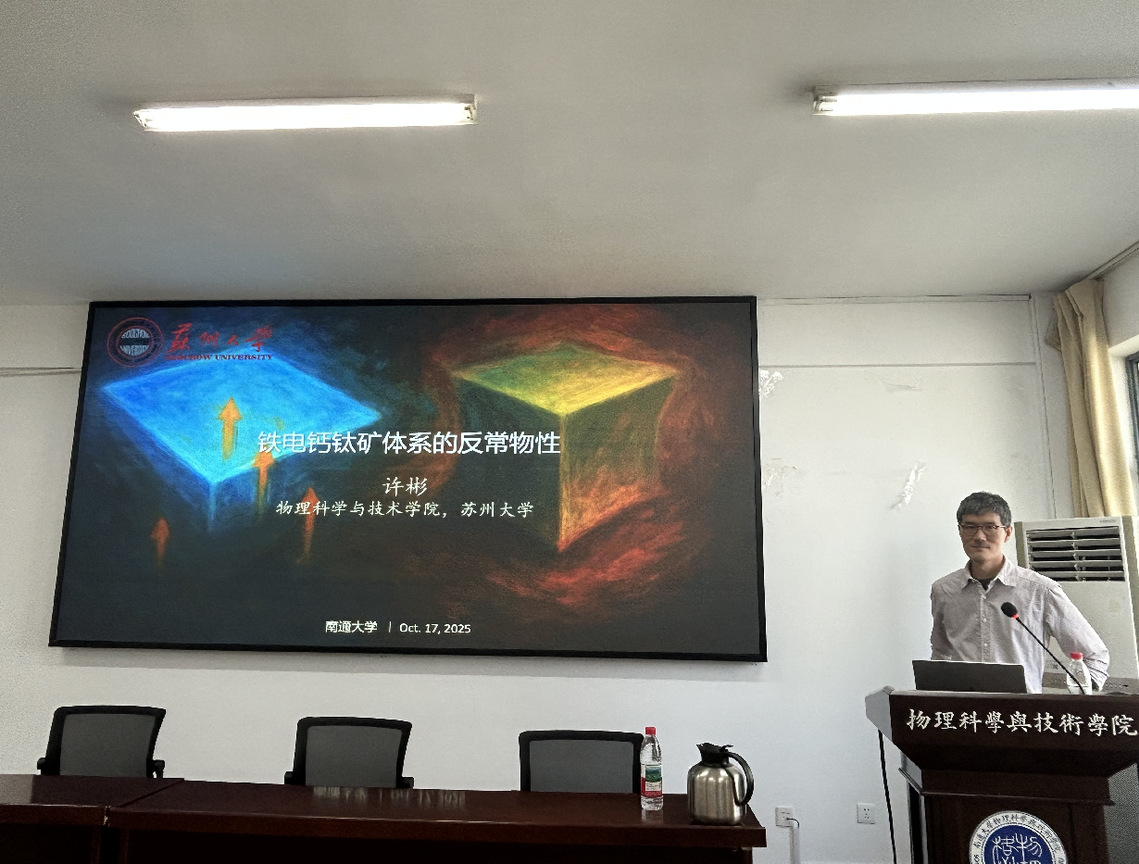 10月17日,苏州大学看球直播下载 许彬教授应邀访问我院,并作了题为“铁电钙钛矿体系的反常物性”的专题学术报告。报告会由看球直播下载 院长仲崇贵教授主持。