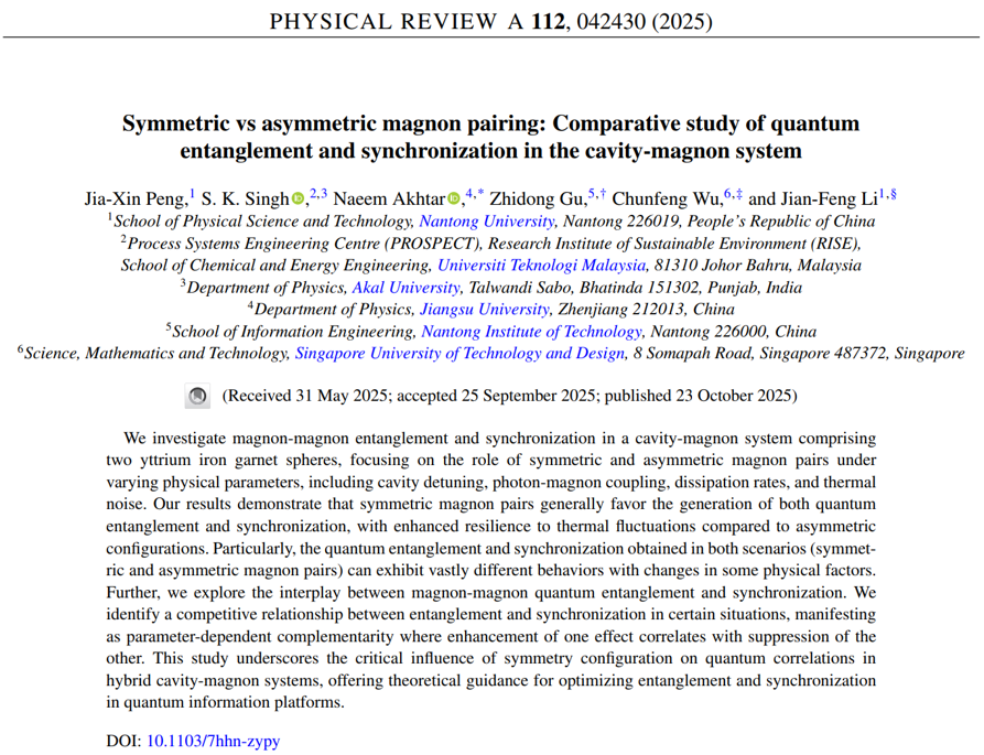 近日,我院彭家鑫博士、李剑锋副教授与马来西亚理工大学S. K. Singh博士后、新加坡科技设计大学吴春凤教授等学者合作,在量子纠缠与量子同步研究方面取得新进展。相关研究成果以《Symmetric vs asymmetric magnon pairing: Comparative study of quantum entanglement and synchronization in the cavity-magnon system》为题发表于自然指数期刊《Physical Review A》上。看球直播下载-看球直播app 为第一单位。